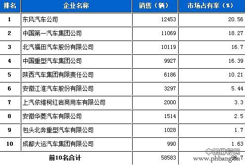 中国汽车工业信息网发布2013年10月份载货车企业销售排行时榜(前十名),数据包括重型载货车、中型载货车、轻型载货车、微型载货车。数据见下面图表:● 重型载货车:东风汽车公司2013年10月份重型载货...